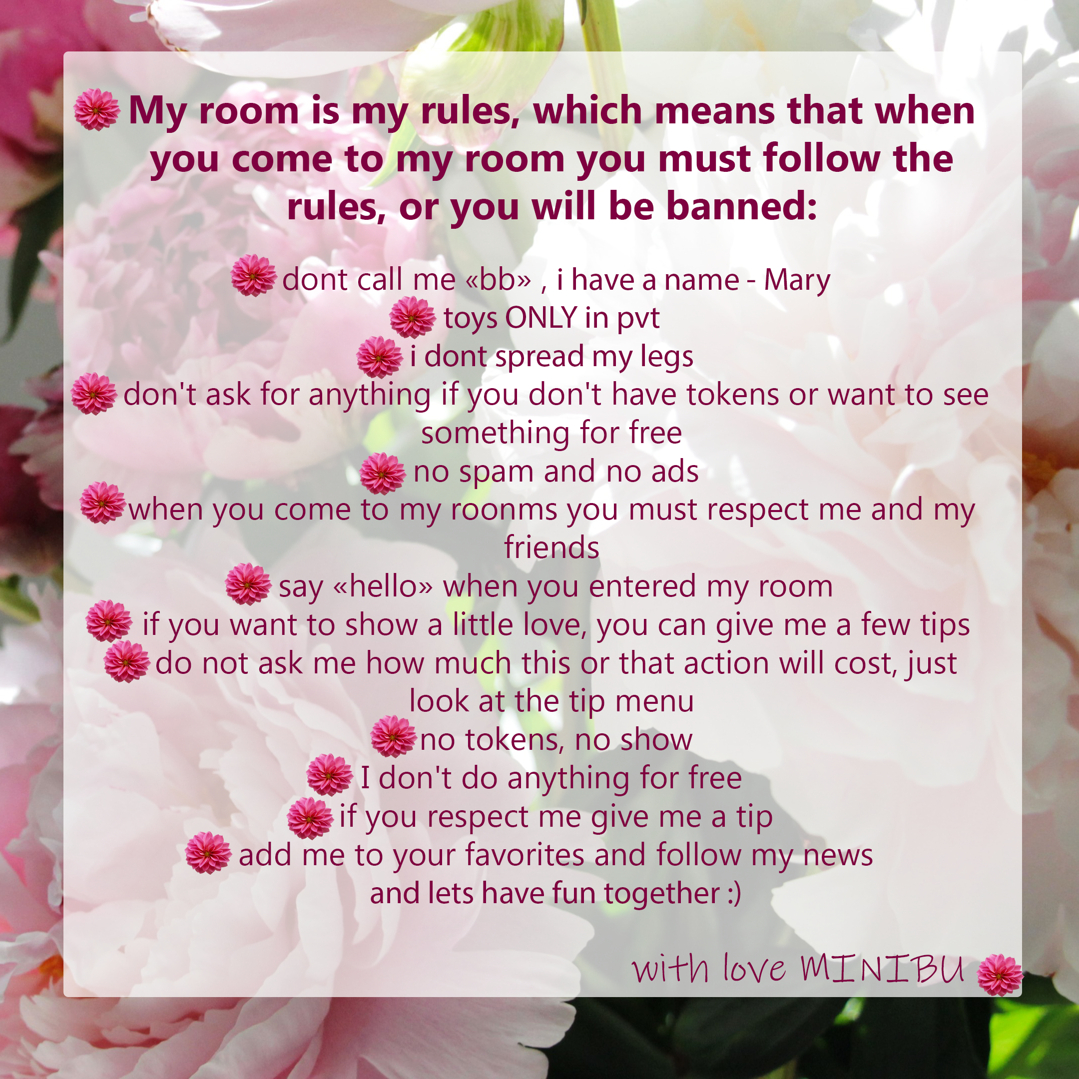 Klikkaamalla painiketta, tulee nostamaan MlNlBU mallin etusivun ensimmäiselle paikalle 60 sekunniksi. Tänä aikana mallin chat huone on paljon paremmin esillä ja uskomattoman suosittu! Ilmoitus toiminnastasi näkyy chatissa, ja se näkevät malli itse sekä muut chatin käyttäjät. MlNlBU arvostaa tätä elettä varmasti ja on mittaamattoman kiitollinen sinulle!